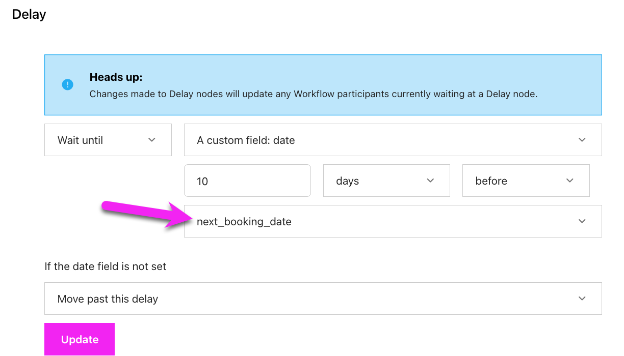 The Delay can be set to wait for a certain amount of time or can be relative to the Date-based Custom field, next_booking_date.