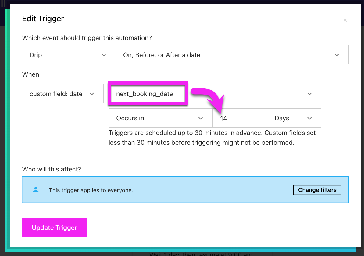 Remember: next_booking_date is a date-based custom field with a value set by the purchase event triggered in the Peek Pro: Post-Purchase Workflow. Activate that workflow to dynamically add people to this workflow based on their booking start date