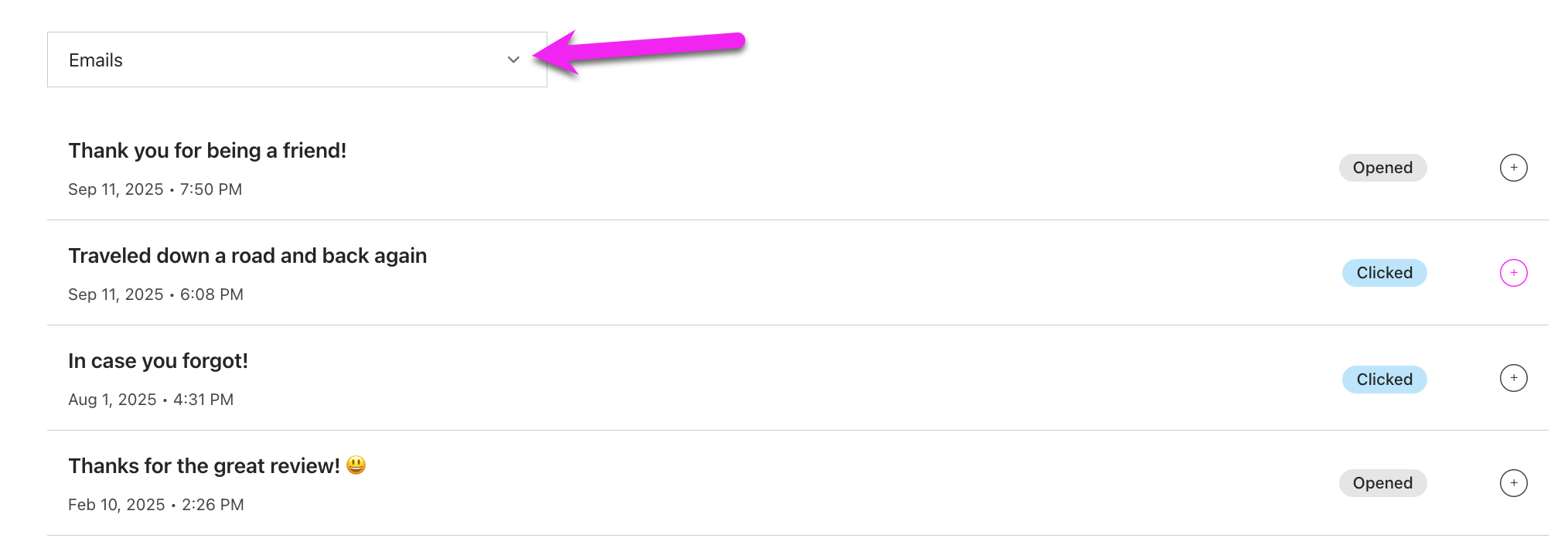 The Emails tab provides a list of the emails sent to a person. This includes all Automation, Single Email Campaign, and Email Series emails.